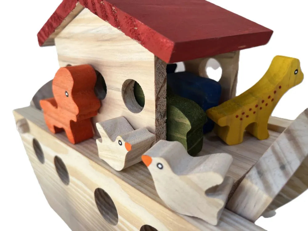 Feita em madeira resistente e segura, o kit inclui a arca e diversos animais para montar e brincar, incentivando o aprendizado por meio da criatividade e da coordenação motora. As crianças podem encaixar, montar e recriar a famosa história da Arca de Noé, explorando cores, formas e pares de animais.