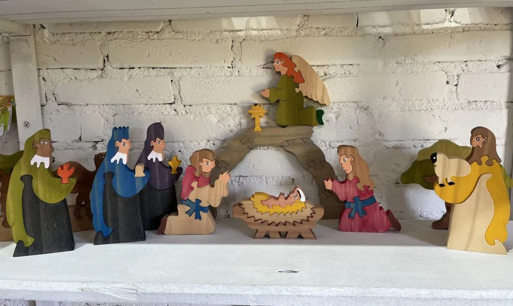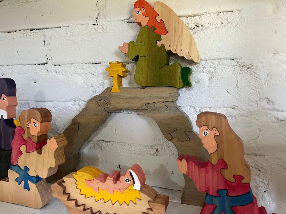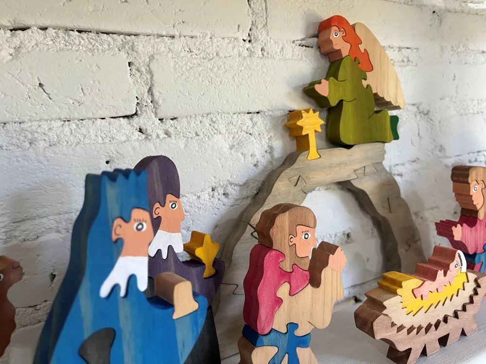 Feito em madeira resistente e segura, o kit inclui 11 peças detalhadas, representando a Sagrada Família, animais e elementos da cena natalina, permitindo que a criança ou colecionador monte e decore o presépio de forma criativa.